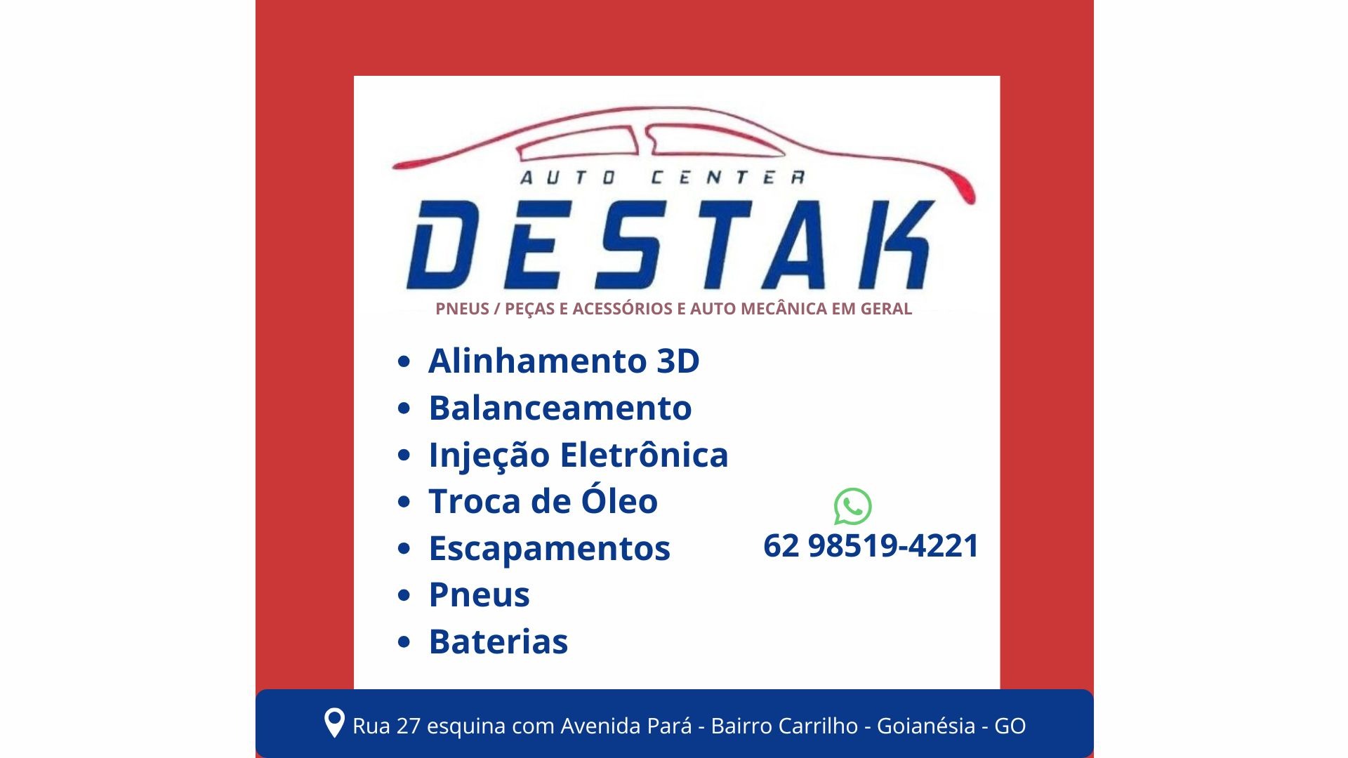 A Auto Center Destak é referência em manutenção automotiva em Goianésia e região, atuando com excelência, tecnologia de ponta e um compromisso inabalável com a segurança e o desempenho do seu veículo. Localizados na Avenida Pará, esquina com a Rua 27, oferecemos um atendimento completo, especializado e pautado na confiança, garantindo que cada cliente saia satisfeito e seguro.
