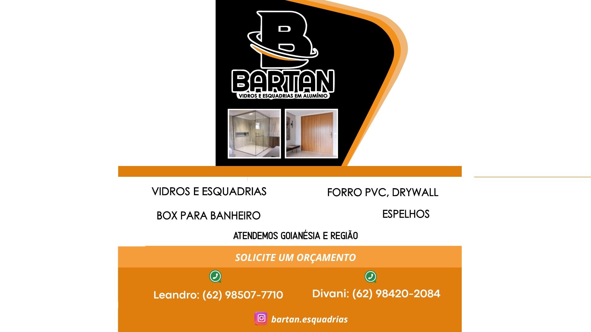 A Bartan Vidros e Esquadrias de Alumínio é uma empresa especializada na fabricação e instalação de esquadrias em alumínio, vidros em geral, box, espelhos, forros de PVC e teto vinílico, com atuação em Goianésia e região.