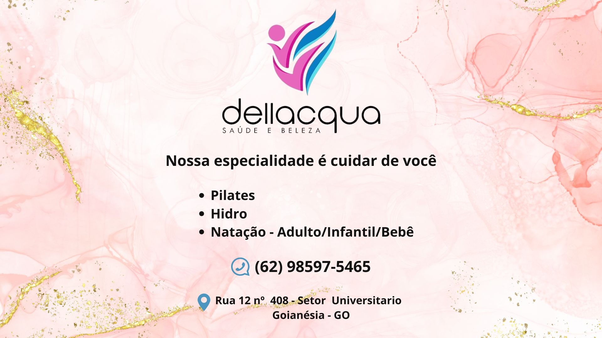A Dellacqua Saúde & Beleza é um espaço dedicado ao bem-estar, à saúde e à qualidade de vida. Oferecemos aulas de Pilates, hidroginástica e natação para adultos, crianças e bebês, com profissionais qualificados e ambiente acolhedor. Nosso propósito é cuidar de você por completo — corpo, mente e equilíbrio.